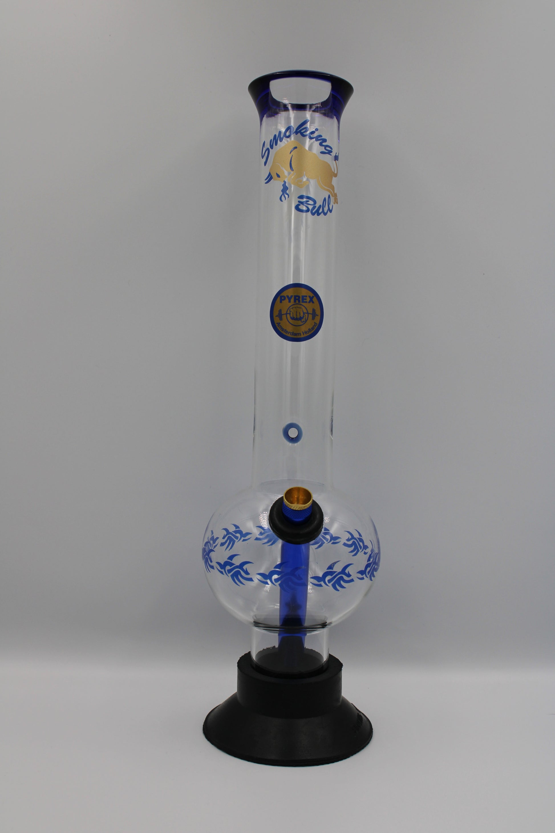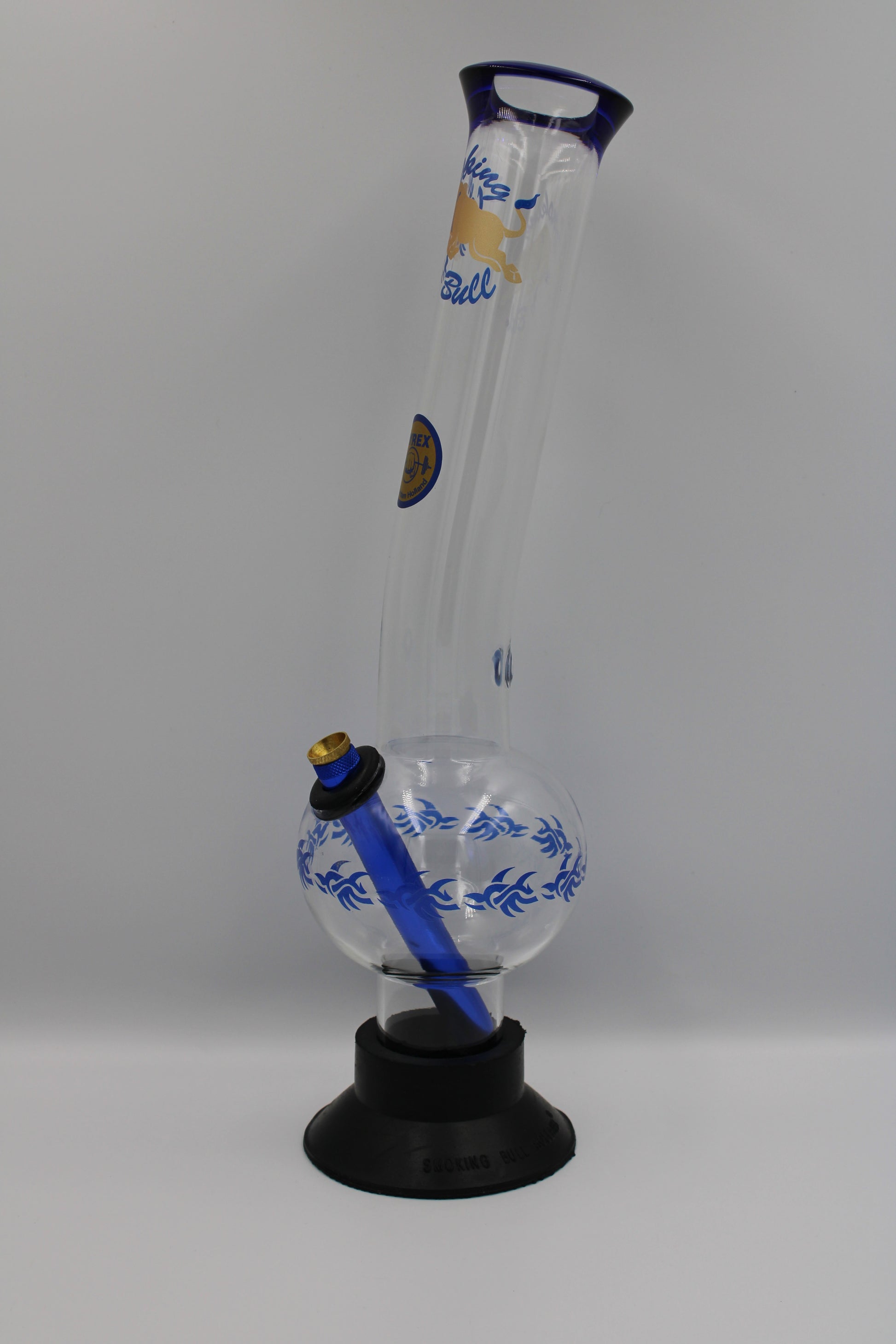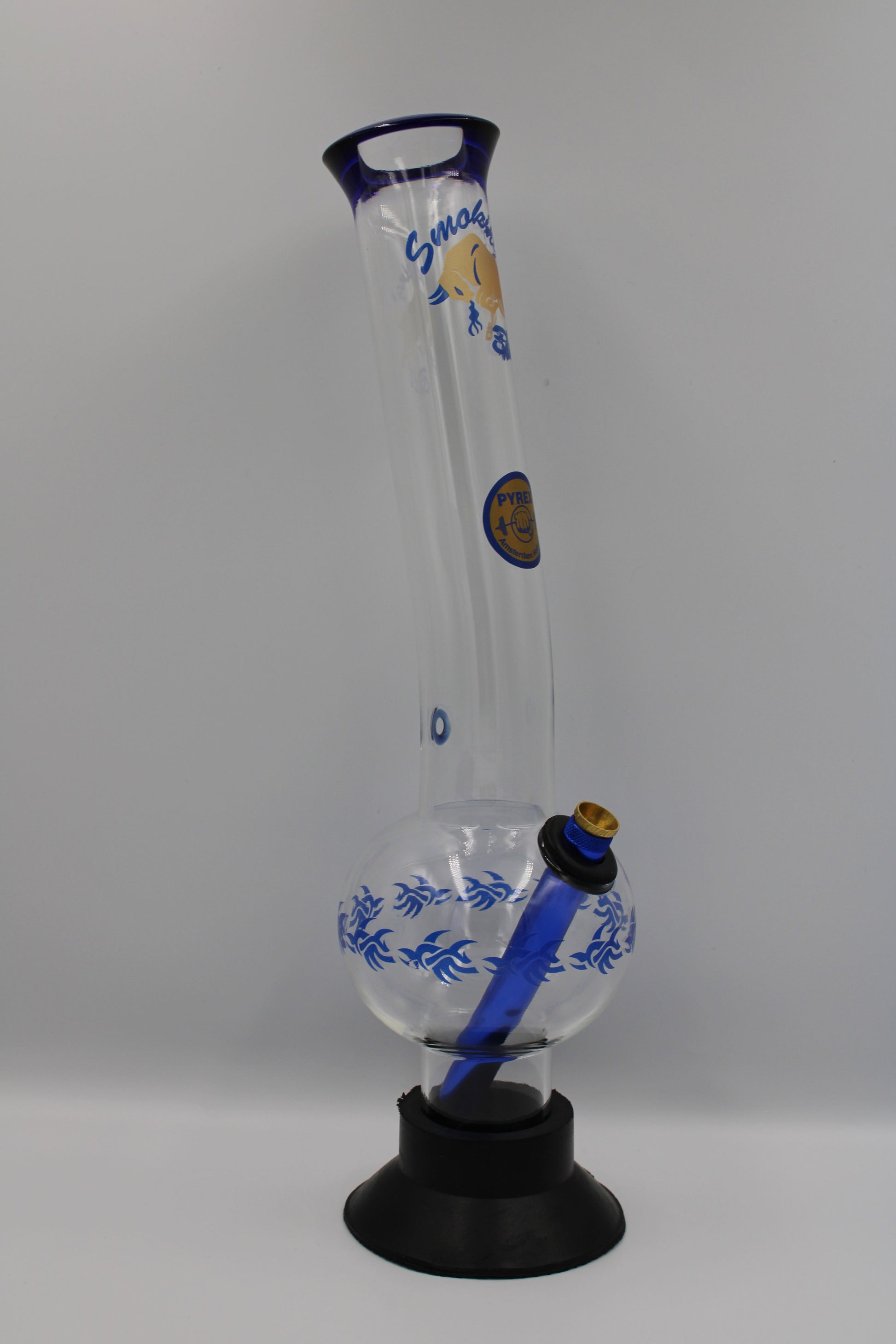 Large bonza style bong with colored tribal design and black base.