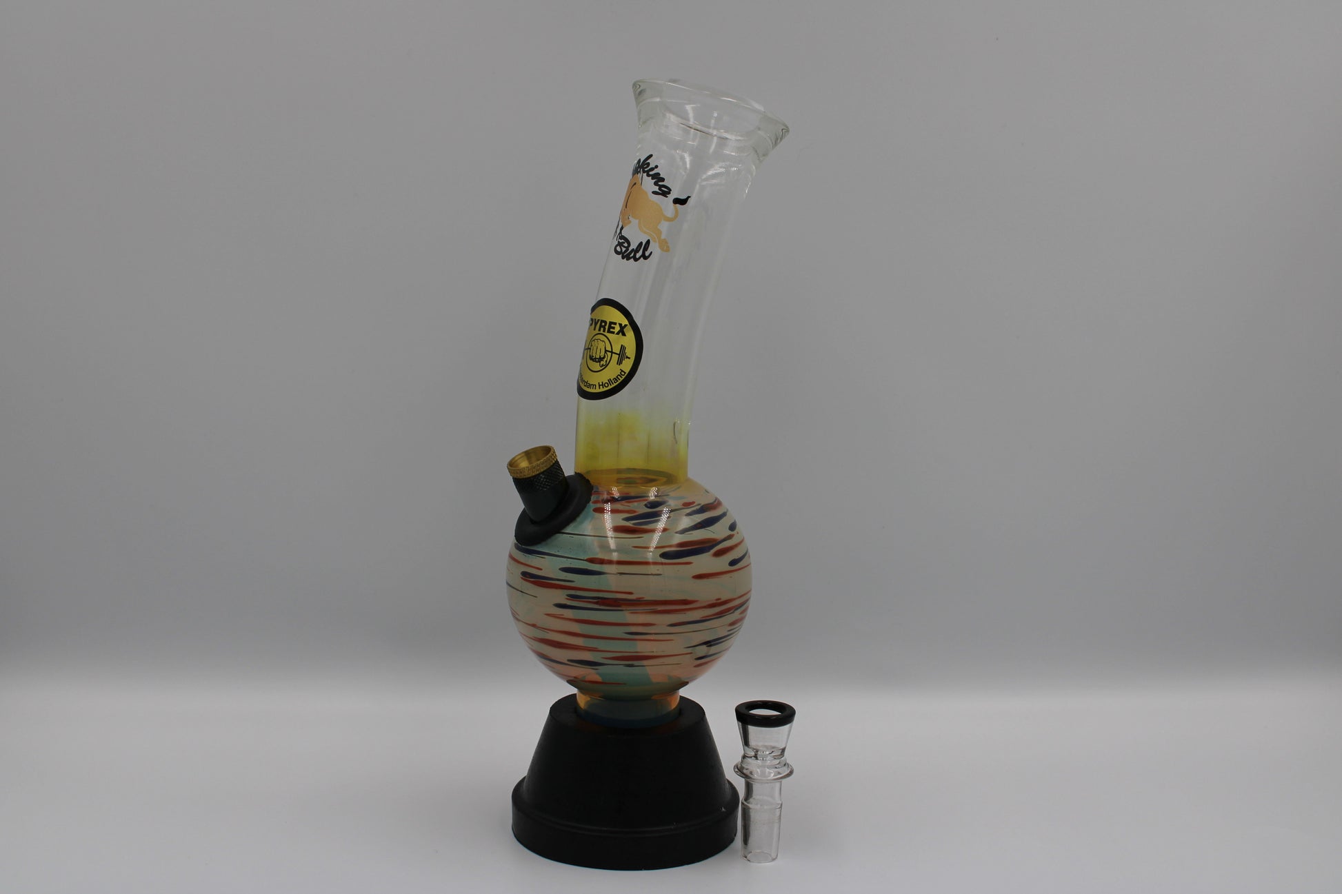 Medium size bonza style bong with black base, coloured swirl design, glass and brass cone pieces.